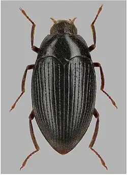 Adults reach a length of 3.72 mm (males) and 4.05–4.13 mm (females). Their body is oval, moderately convex dorsally and integument black. The mouthparts, antennae, and legs are reddish brown.