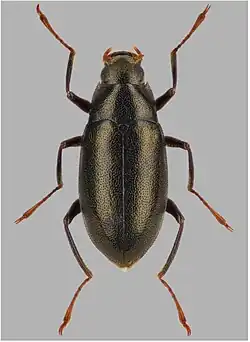 Adults reach a length of 2.90–3.33 mm (males) and 2.88–3.35 mm (females). Their body is oblong-ovate, dorsally convex and integument black, while the mouthparts, antennae, trochanters, basal parts of the femora, and tarsi are reddish-brown. The dorsum has a fine bronze metallic lustre.