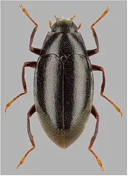 Adults reach a length of 2.94–3.33 mm (males) and 2.81–3.32 mm (females). Their body is oblong oval, moderately convex dorsally and integument dark brown to black, while the mouthparts and antennae are light reddish brown and the legs dark reddish-brown.