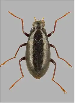 Adults reach a length of 2.64–2.90 mm (males) and 2.46–3.12 mm (females). Their body is elongate oval and black, while the mouthparts, antennae, trochanters, and tarsi are reddish brown and the remaining parts of the legs are dark brown.