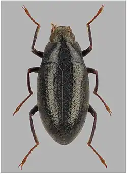 Adults reach a length of 3.29–3.67 mm (males) and 3.51 mm (females). Their body is oblong oval and integument black, while the mouthparts, antennae, and tarsi are reddish-brown.