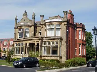 The Elms is a two-storey house built on an L-shaped plan, of red brick, with a sandstone front façade.[1][2] There are three bays at the front, the left-hand of which is gabled.[1] Both the left and right bays have small turrets on either side of the upper windows; the left turrets are topped with pinnacles, the right with crenellated caps.[1][2] The central front entrance has a porch with marble columns.[2] Internally, many of the building's original fittings are intact.[1]