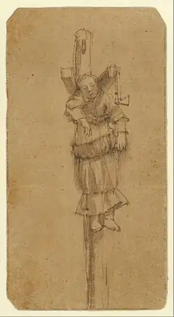 ![]() Elsje Christiaens's body being displayed after her execution. The axe she used to kill is also exhibited. Drawing by Rembrandt van Rijn, 1664 | |