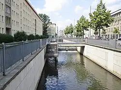In the 12th century[7] the Elstermühlgraben was built to regulate the regular spring floods and to operate mills. Some of these were still preserved and in use until the late 19th century (such as the Angermühle, which was demolished in 1878). A settlement on the banks of the Mühlgraben has been documented since the early 13th century. Until Leipzig's strong expansion around 1850, the canal lay completely outside the city proper. As part of the expansion of the Ranstädter Steinweg, the Mühlgraben was arched over in this area in 1878. In the 20th century, Leipzig's rivers became very polluted by the discharge of sewage and their inner-city courses were largely arched over or piped, as was the case with the Elstermühlgraben around 1960. Since the reunification of Germany in 1990, the water quality has noticeably improved, which is why the previously almost 1,000 m (3,281 ft) long underground section of the Mühlgraben has been gradually reopened since 2004 for renaturation and to improve the quality of living and leisure as well as flood protection.
