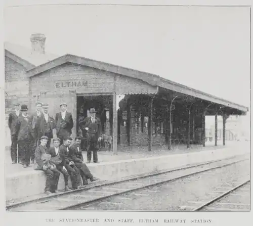 ![]() The stationmaster and staff at the Eltham railway station posing on 11 December 1902. | |||||
