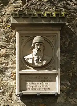 - Johannes Gutenberg was named on 17 January 1465 a courtly nobleman by the Archbishop and Elector Adolph II of Nassau, who at the time resided in the Electoral castle at Eltville. Presumably under Gutenberg's guidance, the Brothers Bechtermünz founded a small printing shop. This published in 1467 the Vocabularius ex quo, a Latin dictionary. In this workshop, Thomas Aquinas's Summa de articulis fidei (1472) was also reprinted. This made Eltville one of the cradle towns of book printing. In the castle tower, a memorial recalls Gutenberg. Gutenberg's brother, Friele Gensfleisch, lived in Eltville from 1434 until his death in 1447. The Gensfleisch-Haus still stands today right next to the castle.