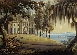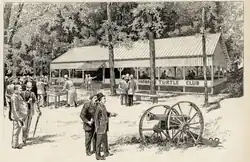 In 1830, the Stevens family erected near Turtle Cove a Grecian-style pavilion, known as the Colonnade, which opened for business in 1831.[29][30] Stevens boasted that it was "devoted largely to the worship of Bacchus" (drinking and revelry).[5] There was already a tavern on the premises, the "large commodious '76 House," or "Tavern on the Knoll," an inn situated on the sloping lawn between the ferry dock and Stevens mansion.[5] The Colonnade's "white front and Doric pillars made it an impressive edifice."[31] The Colonnade appears prominently in countless 19th century illustrations of activities at the Elysian Fields. It was one of the favorite hangouts of ball players after the conclusion of games.[3]