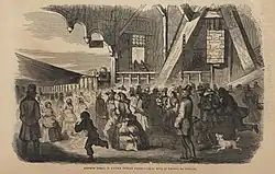 In the 1830s, a tribe of Native-American Penobscots arrived from Maine to entertain and sell handmade merchandise. For over a decade they staged "Indian dances," held canoe races, and sold fine handwoven baskets to tourists.[3] Jugglers, rope dancers, musicians, and magicians performed amid the crowds, and there were carnival rides and culinary delicacies in abundance. Liquor flowed freely and tobacco fumes were everywhere.[3][5] "Among the entertaining features that Colonel Stevens installed on the Green near his ferry dock," wrote Mann, "were a primitive Ferris Wheel, a Merry-go-round, a ten-pin alley, wax figures, a Camera Obscura, and a Flying Machine, or as Stevens called it, a "Whirligig"."[5]