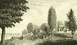 The Elysian Fields became a popular destination for city-weary New Yorkers, with ferries to the grounds originating at Barclay, Canal, and Christopher Streets. "From the opening of the 'River Walk' to the public in about 1810, until the Civil War," wrote historian William Mann, "New Yorkers flocked to the Elysian Fields in the summer months. Among the luminaries that history records as visitors were Charles Dickens, Edgar Allan Poe, Martin Van Buren, Daniel Webster, and Washington Irving. Descriptions of the place were made by many of the park's visitors, including [William Cullen] Bryant, Mrs. Frances Trollope, Frances Kemble, and scores of lesser-known writers."[5] During its midcentury heyday, the grounds drew upwards of 20,000 visitors on weekends,[3] and proved a financial bonanza for the family of Col. Stevens. According to Gilbert: