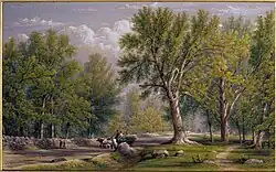 As a result of such incidents and the consequent negative publicity, attendance at the grounds began to fall in the mid-1830s. "During the last years of Colonel Stevens' life [he died in 1838]," wrote Mann, "his park began its gradual decline—a fact hard to imagine for the student of baseball who assumes the park and the game flourished in tandem."[5] To counter potential economic reversals, "Stevens staged events, such as musical concerts, ox roasts, Indian war dances, sideshow acts, bare-knuckle boxing matches, sailboat races, hot-air balloon demonstrations, and oratory competitions."[5] At this stage, the Elysian Fields still had another three decades of popularity and recreational activity ahead, but the grounds were becoming increasingly disreputable.[5][9] The Elysian Fields' tree-lined groves gained notoriety as "lovers' paths," where couples could discreetly express the sort of physical affection generally frowned upon in public. In 1844, New York lawyer/musician George Templeton Strong lamented in a (posthumously published) diary entry,