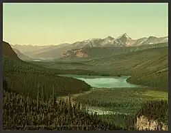 The first non-indigenous person to set sight on Emerald Lake was Canadian guide Tom Wilson, who stumbled upon it by accident in 1882. A string of his horses had gotten away, and it was while tracking them that he first entered the valley. The lake had an impression on him: "For a few moments I sat [on] my horse and enjoyed the rare, peaceful beauty of the scene." It was Wilson who gave the lake its name because of its remarkable color, which due to a different rock type producing the sediment that is suspended in the glacial water, reflects the green spectrum of sunlight rather than the blue spectrum seen in Moraine, Hector, Bow and Peyto Lakes in neighboring Banff National Park. However, this was not the first time Wilson had named a lake 'Emerald'. Earlier that same year he had discovered another lake which he had given the same name, and that name even appeared briefly on the official map. This first lake however, was shortly renamed Lake Louise.[3]
