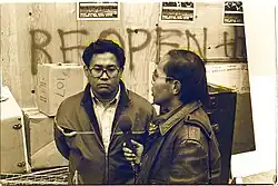In the mid-1970s, de Guzman served as vice president of the International Hotel Tenants Association (IHTA) during the critical years leading up to the hotel's eviction in 1977.[9] His rise to leadership was largely a result of his volunteer efforts after a hotel fire in 1969, where an arson resulted in the death of 3 tenants.[10] He had additionally resided in the hotel as an on and off resident for over five years.[11] In 1975, he was the first to alert the KDP regional leadership that the hotel was in the process of being sold to the Thailand-based firm Four Seas Corporation.[6] Along with other KDP members and activists, de Guzman responded to the crisis by working with the Tenants Association.[6] Everyday a small number of tenants led by the president of the Tenants Association, Wahat Tampao, and de Guzman protested at City Hall by blocking the corridors and demanding an audience with the mayor or members of the Board of Supervisors.[6] Afterwards, they would go across the street and demand a meeting with the executive director of the Redevelopment Agency or the Housing Authority.[6]