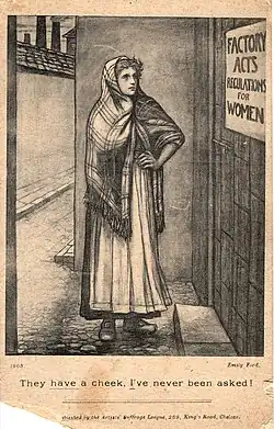 1905 saw the upsurge in the women's suffrage movement, and with it Ford returned to political activism. Ford had a studio in Chelsea that was described by fellow artist, Dora Meeson as "a meeting ground for artists, suffragists, people who "did" things".[2] Later, as vice-president of the Artists' Suffrage League, she used her talent to promote the suffrage cause. In 1908 she designed They Have a Cheek I've Never Been Asked. The image refers to powerless women employed in factories and their oppression.[20] The poster was used as a means to promote the cause of the National Union of Women's Suffrage Societies and their bid to improve the conditions of working-class women. She continued to devote herself to religious art designing stained glass windows and painting murals, but also produced posters, banners and shields for the suffrage movements.[16]