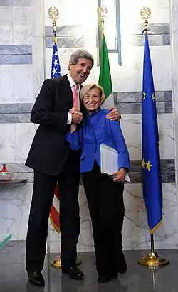 Emma Bonino OMRI, CdrLH (born 9 March 1948)[1] is an Italian politician. She was a senator for Rome between 2008 and 2013, and again between 2018 and 2022. She also served as Minister of Foreign Affairs from 2013 to 2014. Previously, she was a Member of the European Parliament and a member of the Chamber of Deputies. She served in the government of Italy as Minister of International Trade from 2006 to 2008. She was European Commissioner for Health and Consumer Protection in the Santer Commission (1995–1999).