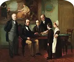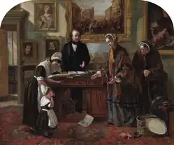 Brownlow created four paintings in the same format depicting scenes from Foundling Hospital life and are permanently displayed at The Foundling Museum. The first oil painting, dated from 1858, is titled The Foundling Returned to its Mother and is the most prominent painting of the four, depicting a mother of a foundling receiving her child back into custody. Her next painting was done in 1863, The Christening, followed by The Sick Room (1864), an oil on canvas painting depicting a romanticized version of a child being cared for in the Foundling Hospital. The fourth painting is titled Taking Leave (1868) and shows the process of a foundling preparing to begin work. The paintings are noted not only for their representation of the Foundling Hospital, but for their inclusion of reproductions of famous paintings in the Hospital's collection; including two major works by William Hogarth and one by Benjamin West. Catherine Roach notes that Brownlow's reproductions of Old Master paintings "stage a drama of redemption" for Foundling children using submerged representations of glorious causes.[5] Rachel Bowlby argues that these paintings "carried on her father's work, promoting the virtues and values of the institution through pictures of its daily life and rituals."[6] Brownlow also painted smaller works depicting foundling children as well as portraits.
