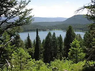 Emma Matilda Lake is located in Grand Teton National Park, in the U. S. state of Wyoming.[2] The lake is named after the wife of William O. Owen who was the first, along with three other climbers, to ascend to the summit of Grand Teton in 1898. The natural lake is 2.7 miles (4.3 km) long and can be reached by way of a 1-mile (1.6 km) hike from a parking area at Two Ocean Lake or via a slightly longer hike from Jackson Lake Lodge.[3] The 10.7-mile (17.2 km) Emma Matilda Lake Trail circles the lake and offers distant views of the Teton Range.[4]