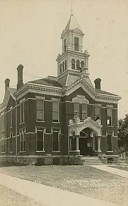 Emmet County was created in 1851, but because it lacked settlers, no county government was established until 1858 and a vote was taken on February 7, 1859.[1] A group of three commissioners chose Estherville to be the county seat. A Fort Dodge, Iowa contractor received a contract to build a schoolhouse and a courthouse in 1859. The schoolhouse was completed and the construction on the courthouse was under when the county realized it could not pay the contractor with the land it promised because the surveyor general would not accept the surveys done in Emmet County and release the land.[2] The contractor established land agencies in the eastern United States that issued worthless land deeds. When the landowners arrived in the county they found out they had to homestead the land in order to receive the land from the government. The completed school building was moved to a different location and it was used as the courthouse until 1876 when it was destroyed by fire.