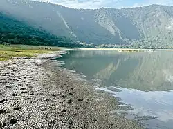 The Empakaai Crater or Embagai (Kasoko la Empakai in Swahili, also Ela Nairobi) is a collapsed volcanic caldera located in Naiyobi ward of Ngorongoro District in Arusha Region of Tanzania. It is 300 meters high and 6 kilometers wide. The crater is filled by a deep alkaline lake (a soda lake[2]) that occupies around 75% of the crater's bottom and is approximately 85 meters deep. The crater is a caldera and is within UNESCO Biosphere Reserve protection program.[3] Empakaai's elevation on the outside is 3,200 m above sea level on the western side and 2,590 m above sea level on the eastern side. Empakaai is nearly always blanketed in mist due to its high altitude, and the lake appears emerald or deep blue in color. The crater is part of the Crater Highlands geographic zone.[4]