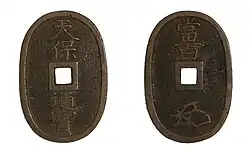 An analysis of silver currency in China and Japan "Sin sen sen pou (Sin tchuan phou)" was presented to the Emperor in 1782 by Kutsuki Masatsuna (1750–1802), also known as Kutsuki Oki-no kami Minamoto-no Masatsuna, hereditary daimyōs of Oki and Ōmi with holdings in Tanba and Fukuchiyama.[3] Masatsuna published Seiyō senpu (Notes on Western Coinage) five years later, with plates showing European and colonial currency.[4] Countrywide currency reforms later came after the Meiji Restoration when a new system was adopted around the Japanese yen. In 1786, former Empress Go-Sakuramachi engaged Go-Momozono's only child (Princess Yoshiko) to the new emperor. Yoshiko formally became Empress consort to Emperor Kōkaku at age 15.