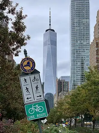 ![]() Signs for Mile 0 at the Hudson River Greenway, south end of Empire State Trail at Battery Place, New York City. The walkway is left of the bikeway. | |