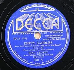 "Empty Saddles (in the Old Corral)" is a classic American cowboy song written by Billy Hill. Hill based the song on a poem by J. Keirn Brennan grieving for lost companions.[1] The song became widely known to the public in July 1936, when Bing Crosby sang it with deep emotion in the Paramount musical Rhythm on the Range,[2] and his Decca recording of it, made on July 14, 1936, with Victor Young and His Orchestra,[3] reached the Top 10 that September.[4]