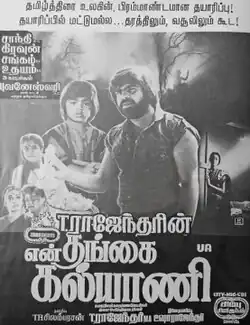 En Thangai Kalyani (transl. My sister Kalyani) is a 1988 Indian Tamil-language film written, directed and produced by T. Rajendar. Rajender appeared in the lead role, with Sudha. The film featured Rajendar's real life children including his son Silambarasan. It was released on 5 February 1988.[1] Silambarasan won the Best Child Artist award at the 10th Cinema Express Awards.[2]