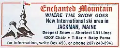 Enchanted Mountain was designed by E.H. Lord-Wood Associates and built in 1965 by North Haven Construction Company on land that was reportedly leased from Scott Paper Company, who would later become owner of nearby Big Squaw Mountain Resort. The ski area first opened in February 1966[2] with two lifts: a T-bar that would serve only two trails above the base lodge that season and a baby poma lift to serve the beginner ski area below the lodge.[1] The following year a 4,200 ft. Poma double chairlift was constructed to the summit, increasing the trail count to seven. One wide open slope was located underneath the lift with six narrower, winding trails fanning out from the top. The vertical drop was only about 1000 ft. but some brochures and guidebooks exaggerated it to as much as 1800 ft. The area boasted that it had the deepest snow and shortest lift lines. In 1968 the lifts operated daily and an adult lift ticket was only $5.50.[2]