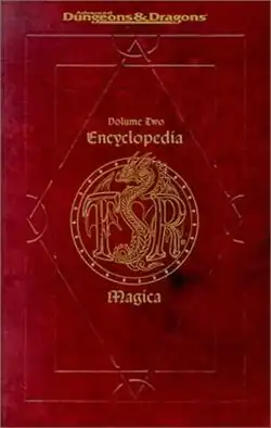 Encyclopedia Magica is a four-volume set intended to present every magic item ever published for Dungeons & Dragons up to that point, from Abacus of Calculation to Zwieback of Zymurgy.[1] The books in this series list every magical item published in all boxed sets and game supplements and every magazine article published for the AD&D game system from the previous 20 years.[2] The books total more than 1500 pages over the four volumes, and each is bound in a plastic jacket resembling leather.[1] Entries for the series were reproduced from sources including the Dungeon Master's Guide, the Dungeons & Dragons Basic Set and Dungeons & Dragons Expert Set, adventure modules and campaign settings, magazines such as Dragon.[1]