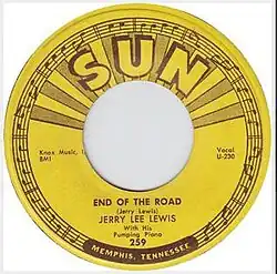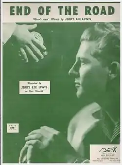 "End of the Road" is a song written and performed by musician Jerry Lee Lewis. Recorded in 1956, and released as a single in December of that year on Sun Records, the single was backed with Lewis' cover of the Ray Price song "Crazy Arms".[1][2] The recording was reissued in 1979 as a 7" 45 single as Sun 14 as part of the Sun Golden Treasure Series.[3] The song was also released in Canada in 1956 as a 45 single on Quality Records.