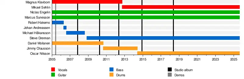 On 18 April 2006, Robert Hakemo was replaced by Johan Andreassen.[4] On 5 August 2006, Michael Håkansson became the new bass player.[5] On 14 August 2008, Håkansson left the band to pursue other opportunities. Steve Drennan (Amon Amarth) took over playing bass during November 2008. During 2010, the band replaced their drummer Daniel "Mojjo" Moilanen with Jimmy Olausson, who also plays drums for Marionette. In June 2014, Olausson quit the band and was replaced with Oscar Nilsson.[6]