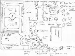 Most plant varieties chosen have been known to exist in Australian gardens prior to 1850. The lack of grassed areas reflects the fact that "cottage beds" were easier to maintain than lawns. Areas are connected with gravel, stone or brick paths. An eccentric orchard under-planted with white evening primrose, alyssum and bulbs forms a second section. The orchard is bisected by a winding gravel path where azaleas grow. The left side of the orchard provides more circular forms and incorporates a stone folly to mark the ruin of a former stable and loft known to have existed at this position. The statue is placed at the intersection of various axes including those from the stair light window and back door. A third section is a drying court and kitchen garden (currently a herb garden and strawberry patch), which leads through the hedge to a formal parterre cottage garden with sundial centrepiece. The hedge is African olive (Olea europaea var.africana), a common form of colonial hedging. The seedlings were collected from surrounding paddocks and planted in 1989. The hedged parterre is being converted from self-seeding annuals to a rose garden of older European varieties (15th to 19th centuries), grown on their own roots (where available) and under-planted with hardy perennials.[2][1]