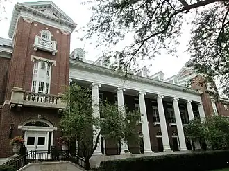 Contrary to popular belief, the building never served as a residence hall.[4] The first campus residence hall for female students was Busey Hall, which was completed in 1917. Before Busey Hall, female students typically lived in sorority houses, boarding houses, or private homes. Religious groups stepped in to fill the housing shortage as early as 1909, when the Episcopalians built a church-affiliated residence hall that could house thirty women. This facility, known as Osborne Hall, was located across Wright Street from the Woman's Building;[3] since 1919, it has served as the Chi Omega sorority house.[5]
