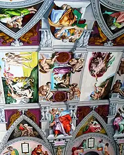 Following a visit with his wife and children to the Sistine Chapel in Rome for the beatification of the English Martyrs in 1987, sign-painter Gary Bevans was inspired to paint a copy of the Sistine Chapel frescoes on the ceiling of English Martyrs' Church.[5] The frescoes painted by Michelangelo on the ceiling of the Sistine Chapel from 1508 are regarded as one of the major artistic accomplishments of human civilisation.[6][7] Bevans realised that English Martyrs' Church is the same width as the Sistine Chapel in Rome, and slightly shorter in length.[5] Bevans had already produced works of art for the church. These included images of two of the English Martyrs - St Thomas More and St John Fisher, and a painting of the Last Supper which unusually includes Mary on Jesus' left, a young child and a Yorkshire Terrier.[8]