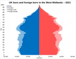UK born and foreign born population pyramid in the West Midlands in 2021