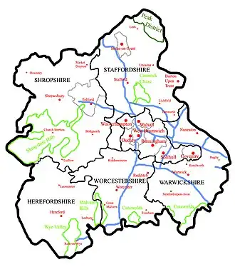 The official region contains the ceremonial counties of Herefordshire, Shropshire, Staffordshire, Warwickshire, West Midlands and Worcestershire.
