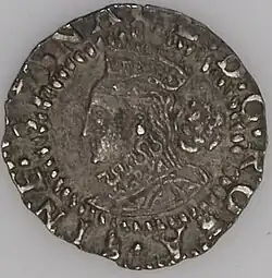 The silver three-farthing (3⁄4d) coin was introduced in Queen Elizabeth I's third and fourth coinages (1561–1582), as part of a plan to produce large quantities of coins of varying denominations and high metal content. It was worth 1⁄16 shilling, or 1⁄320 pound sterling.