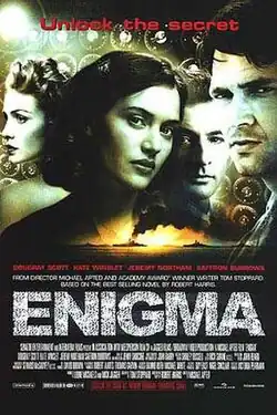 Enigma is a 2001 espionage thriller film directed by Michael Apted from a screenplay by Tom Stoppard. The script was adapted from the 1995 novel Enigma by Robert Harris, about the Enigma codebreakers of Bletchley Park in the Second World War.