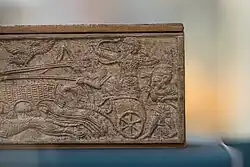 Four Cypro-Minoan Script tablets have also been found, three in the Cyprus Museum in Nicosia and the last in the Louvre Museum.[35] One tablet (#1885) was found in the north area of the site in "room 103 of the Late Cypriote I building called the Fortress", with only the top portion remaining. It is written in the Cypro-Minoan variant and dates to LC IB (1525–1425 BC) and contains 23 total signs, 21 on the obverse and 2 on the edge.[36] Two other tables were found in a Late Cypriote III context, one (#1193 in two fragments) dated to LC IIIB (12th century BC) in the north area and one (#1687) dated to LC IIIA (late 13th-early 12th century BC) in the central area.[37] One, AM 2336, is of unknown context.[1][38]