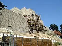 The TPCH was dissolved in July 2005.[153] The next month, the National Trust for Historic Preservation, Los Angeles Conservancy, and Frank Lloyd Wright Building Conservancy jointly formed the Ennis House Foundation to raise money for the house's renovation.[153] The foundation's creation followed advocacy from the actress Diane Keaton,[153][162] who along with Eric Lloyd Wright was named to the foundation's board of directors.[55] At the time, the cost of stabilizing the house was estimated at $5 million,[66] and the renovation was estimated cost $12–15 million.[53][153] In the two years after the Ennis House Foundation was reformed, Keaton and Eric raised about $6 million to restore the house.[8] In 2006, the project received a FEMA grant, as well as a $4.5 million construction loan through First Republic Bank.[107][163] The bank loan was guaranteed by the businessman Ron Burkle,[107][123][164] who had been personally interested in the house since childhood.[165] Eric drew up plans to fix the retaining wall.[31]