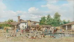 Enrico Bartezago (Lugano,[1] 1820 – c. 1905)[2] was an Italian painter, active in Milan, painting genre scenes, Portraits, and watercolors. In the exhibition of Paris of 1878, he displayed L' aia d' una fattoria lombarda. At the Mostra di Venezia of 1887, he exhibited La scimmia. Other works include Mercato a Varallo and Nemici. In 1891–92, he won the Mylius prize from the Academy at Milan for genre painting for his Alpine Pennine.[3][4]