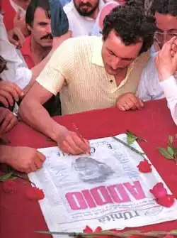 In an article written for Rinascita on 6 December 1982,[58] titled "Party and Society in the Reality of the 1980s", Berlinguer said: "There can be no inventiveness, imagination, creation of the new if you start by burying yourself, your history and reality."[44] In an interview in 1983 with Ferdinando Adornato, he said about communism that "scientists are discussing more about the sole dell'avvenire [the establishment of socialism] today than the communists."[44] That same year, in an interview with Giovanni Minoli about the labour movement, he stated: "We refuse to let the usual ones pay, the workers, the popular masses. And we believe that if there must be sacrifices, and everyone must contribute proportionately, they must contribute to achieving certain goals, not to make the country go backwards."[44] In his last rally, held on 7 June 1984, before his death, Berlinguer said: "We are convinced that the world, even this terrible, intricate world of today, can be known, interpreted, transformed, and put at the service of man, his well-being, his happiness. The test for this goal is a test that can worthily fill a life."[44] During his final rally, held just days later in Padua, he stated: "Everyone work, house by house, company by company, street by street, in dialogue with the citizens, with trust for the battles we have waged, for the proposals we are presenting, for what we were and are. It is possible to win new and wider support for our lists, for our cause, which is the cause of peace, freedom, work, the progress of our civilisation!"[44][59]