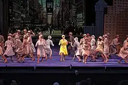 A musical number from Thoroughly Modern Millie features the lead actress (in yellow) with a large ensemble.