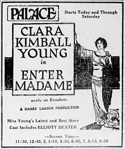 Enter Madame is a 1922 American silent romantic comedy film produced by Harry Garson for his star Clara Kimball Young. Wallace Worsley directed. The film was based on a 1920 Broadway play of the same name by Dolly Byrne and Gilda Varesi. Prints of the film exist in two or three European archives.[1] The film was remade under the same name in 1935.[2][3][4]