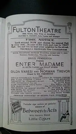 Enter Madame was a 1920 Broadway three-act comedy written by Gilda Varesi and Dolly Byrne, produced and directed by Brock Pemberton. Varesi also played the lead role of opera singer Madame Lisa Della Robia with Norman Trevor playing her husband Gerald Fitzgerald. It ran a total of 350 performances from August 16, 1920 to October 2, 1920 at the Garrick Theatre, from October 4, 1920 - May 21, 1921 at the Fulton Theatre, then May 23, 1921 - April 1922 at Theatre Republic. It was included in Burns Mantle's The Best Plays of 1920-1921.