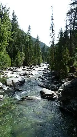 The Entiat River is a tributary of the Columbia River, joining the Columbia near Entiat. The United States Geological Survey (USGS) lists two variant names for the Entiat River: En-ti-at-kwa River and Entiatqua River.[1] The river's name is derived from the Columbia-Moses (Salishan) term /nt'yátkw/ [nt'iátkw], meaning "place of grassy water";[5] another source states that it was called Enteatqua which means "Rapid Water"[6] or "Rushing Water." The name, spelled "Entiat", was selected for the river in 1958 by the Chelan County Public Utility District.