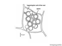 All members of Entorrhizomycetes are obligate parasites on the roots of plants.[8] Sori are produced as galls on the roots of hosts. Galls are tubercular with a globoid, irregular or elongated shape and are composed of vascular bundles, parenchymatous cells and fungal mycelium.[7] Younger segments of the galls are pale in color whilst older segments turn brown.[2] Mycelium consists of dikaryotic and septate hyphae with fibrillate walls that lack clamp connections. Initially, the mycelium grows intercellularily before producing coiled intracellular hyphae terminating in globose cells that detach and develop into teliospores.[2] Teliospores germinate into tetrads through internal septation, and each tetrad compartment produce hyphae that terminate in sigmoid propagules.[2] Bauer et al. noted that young teliospores have two nuclei, older teliospores have only one nucleus, and each tetrad compartment has one nucelus each. This indicates that karyogamy and meiosis occurs in the teliospore.[2] It has been observed that teliospores are liberated when the host plant dies and the galls disintegrate,[7] and that the number of galls is higher in waterlogged soils compared to well-drained soils.[9] These observations might support the hypothesis that entorrhizomycetes disperse through soil moisture.[2]