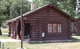 The Entrance Station at Devils Tower National Monument is a log cabin in the National Park Service Rustic style, built in 1941.[2] The cabin is based on 1933 plans created by the National Park Service Landscape Division for a now-vanished caretaker's cabin at Aspenglen Campground in Rocky Mountain National Park, adapted by NPS architect Howard W. Baker of the Branch of Plans and Design for dual use as an entrance station and as a residence.[3] It features a unique porch with rough-cut projecting log ends in a scooped pattern.