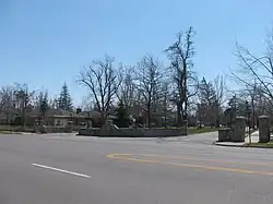Today, Main Street is a four-lane road running east–west through Snyder connecting Williamsville (the other side of Interstate 290, known as the Youngman Expressway) to points westward such as the neighboring hamlet of Eggertsville and downtown Buffalo. The entranceway is located proximate to large residential areas of trees and grass, 1920s-built subdivisions flanking a wide central median.[2] It is situated three blocks east of Harlem Road (New York State Route 240). Across Main Street and northeast from the Entranceway is the Eggertsville-Snyder Branch Library of the Buffalo & Erie County Public Library located at 4622 Main Street.[5][6] Each side of the median serves one-way traffic. The entranceways sit on the two south side corners of this T-junction intersection.[2]