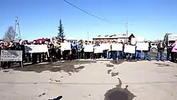 On June 5, 2014, a demonstration was held in Ust-Usa Village in Usinsk District, Komi Republic.[20] The demonstration, held in the same region affected by the 1994 spill, followed earlier protests in Izhma and saw the adoption of a "strongly worded" resolution by Indigenous groups present. Protesters threatened to boycott future Komi Republic elections if their demands were not met.[20] An excerpt from the declaration reads,