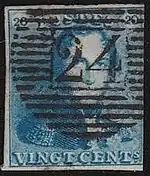 Epaulettes (French: Épaulettes, Dutch: Epauletten)[a] is the name given by philatelists to the first series of postage stamps issued by Belgium. The stamps, which depicted King Leopold I with prominent epaulettes from which the name derives, became legally usable on 1 July 1849. Two denominations with the same design were issued simultaneously: a brown 10 centimes and a blue 20 centimes. They were produced as the result of a series of national reforms to the postal system in Belgium, based on the success of similar British measures adopted in 1840. The stamps allowed postal costs to be pre-paid by the sender, rather than the receiver, and led to a sharp increase in the volume of mail. Although quickly superseded by new types, Epaulettes proved influential and have since inspired several series of commemorative stamps.
